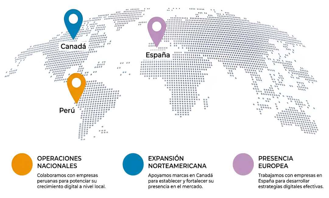 La digitalización no tiene fronteras, y nosotros tampoco. Desde nuestra sede, hemos gestionado con éxito la expansión digital de marcas en mercados nacionales e internacionales. Nuestra metodología de trabajo nos permite comprender y atacar nichos específicos en diferentes latitudes, adaptando el mensaje y la táctica a la realidad cultural y comercial de cada audiencia.